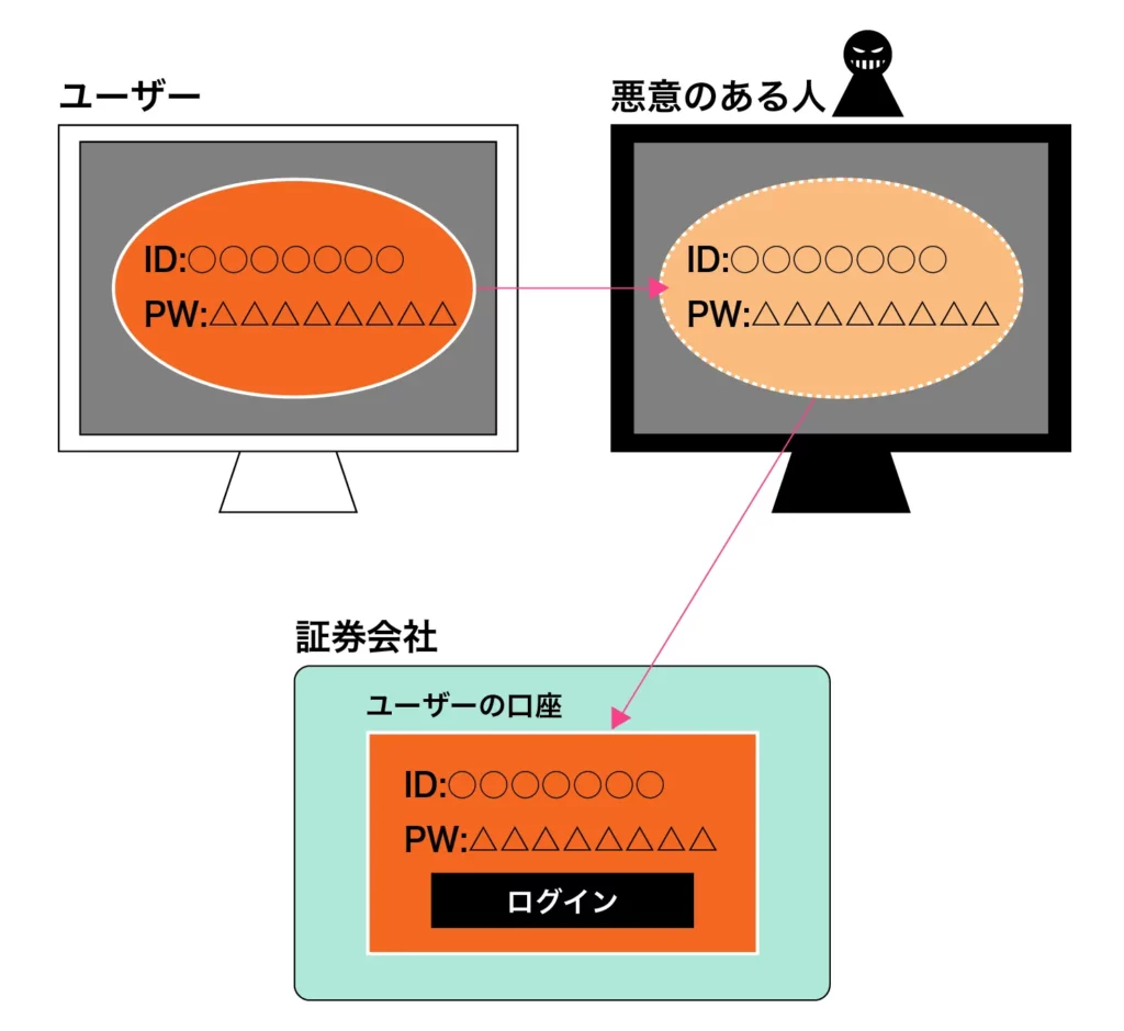 直接資産を管理する証券会社から、顧客の認証情報が漏れるケースも考えられます。こちらの場合、漏えいリスクはユーザー側の管理だけでなく、企業側のセキュリティ対策にも依存します。