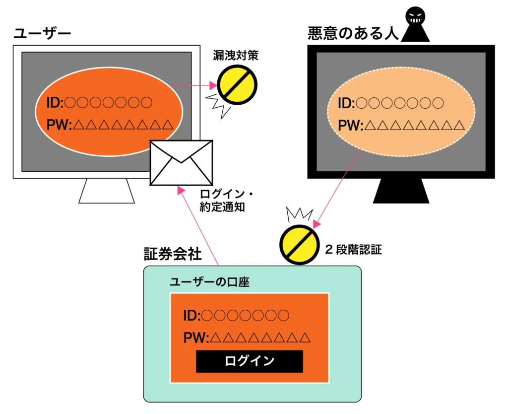 情報漏洩はユーザー自身 or 証券会社のどちらかで発生します。